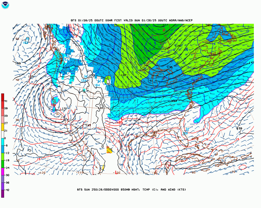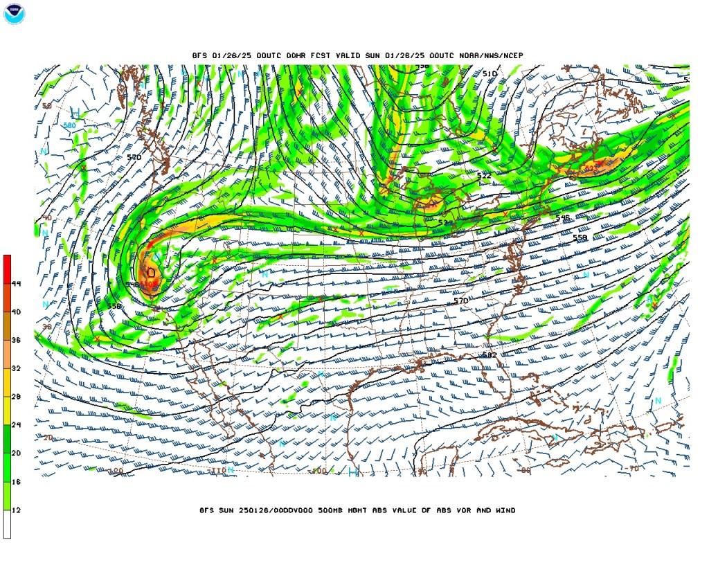 We see a low centered in central California. The colors indicate the tendency of the atmosphere to rotate and compress, called vorticity. Over Illinois and Indiana, the winds are brisk and zonal (east-west). The likely direction of the low is probably toward the southwest. For us, zonal winds mean no dramatic changes in temperature.